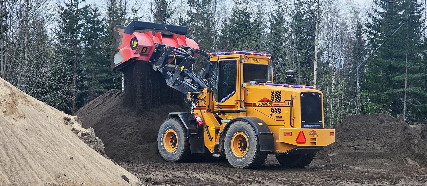 Pyöräkuormaajan varusteina: alueaura 4 metriä, lumikauha 5 m3, sorakauha, tasauskauha, trukkipiikit ja nostopuomi 6 metriä sekä vakaushyväksytty vaaka.
